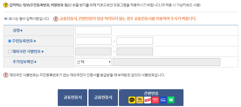 신청인 본인 확인을 위한 인증서 (공동인증서, 금융인증서, 간편인증)