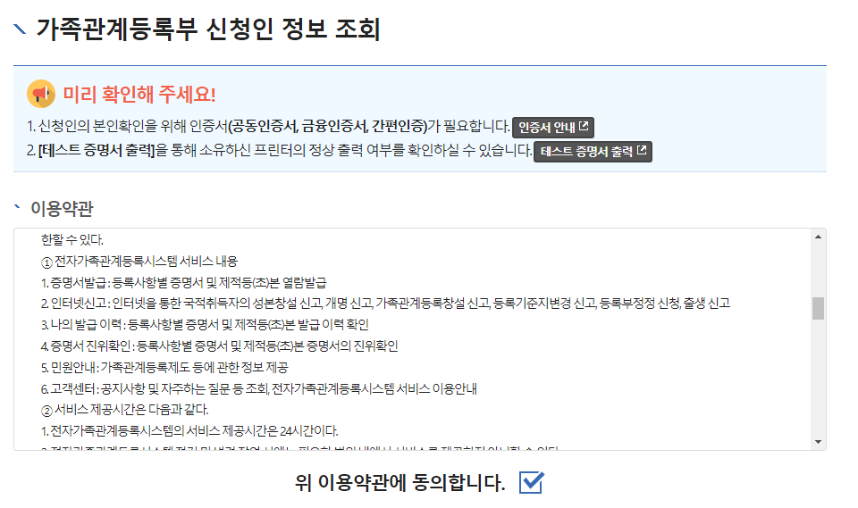 2) 가족관계등록부 신청인 정보를 조회 - 이용약관에 동의 합니다.