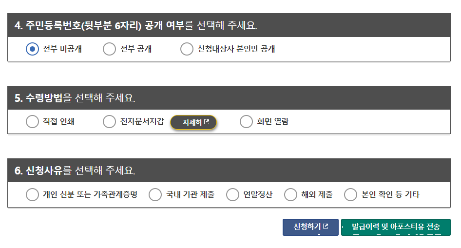 4) 마지막으로 여러가지 선택항목 확인 후 신청하기 버튼 누르면 출력 가능합니다.