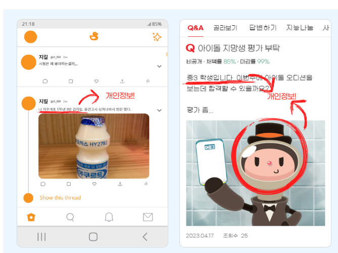 개인정보가 포함된 글, 영상, 사진등으로 인해 피해를 보시거나 삭제하고 싶은분은 반드시 개인정보보호위원회에서 지원하는 지우개 서비스를 이용해보시길 바라겠습니다. 비교적 간단하오니 번거롭다 생각마시고 필요하신분은 꼭 서비스 이용하여 피해 없으시길 바랄게요. 감사합니다.