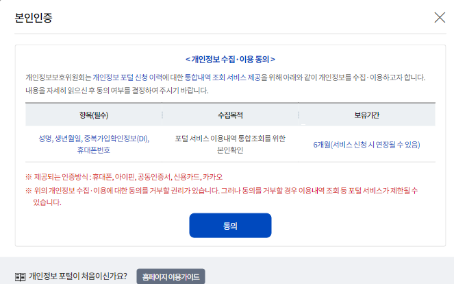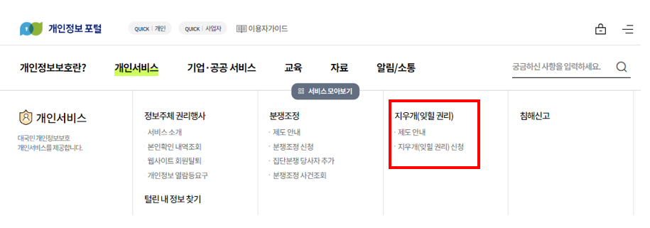 1. 개인정보 포털에 접속하여 개인서비스 - 자우개 서비스 게시판 선택