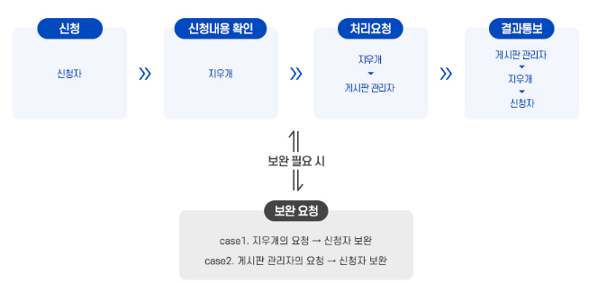 1) 게시물 삭제 : 게시물이 올라기있는 게시판 관리자에게 게시물을 삭제하거나, 삭제된 것 처럼 보이지 않게 해달라고 블라인드 요청하는 것을 뜻합니다.