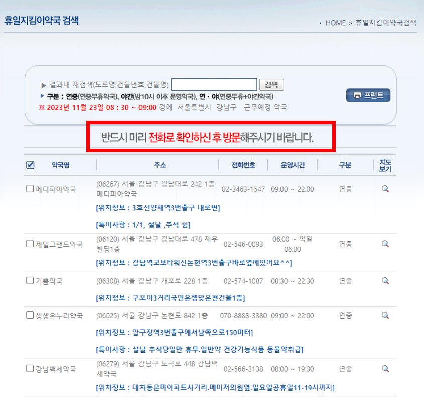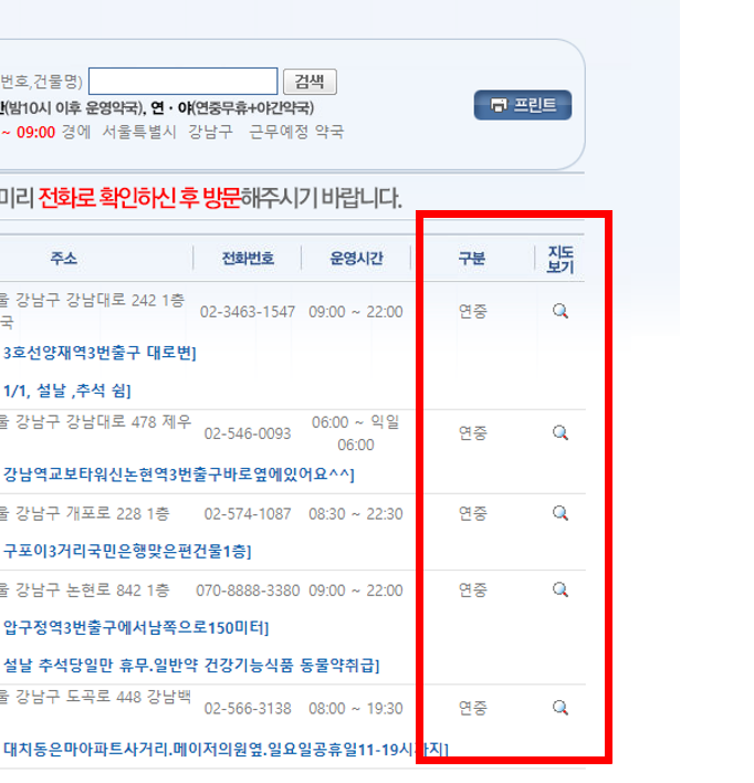 서울시 강남구 기준으로 검색된 약국입니다. 검색되는 약국이 있긴 하지만 약국마다 운영 상황에 따라 문을 여는 곳도 있고, 그렇지 않은 곳도 있기 때문에 반드시 미리 전화로 확인하신 후 방문하는게 좋을 것 같습니다.