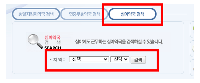 휴일지킴이약국 사이트 메인페이지에서 심야약국 탭을 클릭 후 지역을 검색하면 심야약국 리스트를 확인하실 수 있습니다.