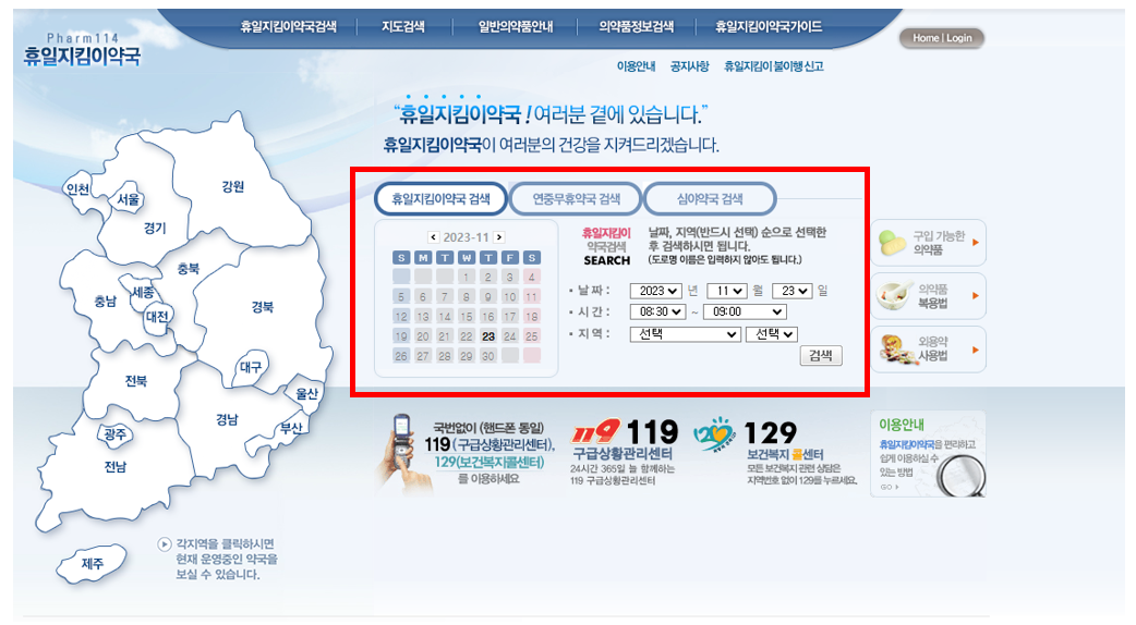 2) 휴일지킴이약국 검색을 위해서는 날짜 / 시간 / 지역을 입력하면 해당되는 약국이 검색 됩니다.