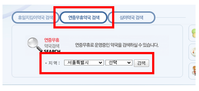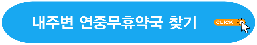 휴일지킴이약국 사이트 메인페이지에서 연중무휴약국 탭을 클릭 후 지역을 검색하면 연중무휴약국 리스트를 확인하실 수 있습니다.