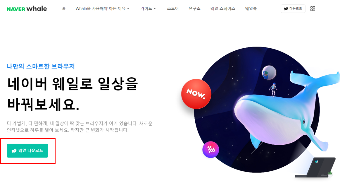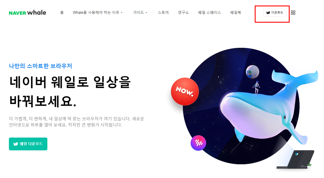 - 네이버 웨일 홈페이지에서 '웨일 다운로드'를 클릭합니다.