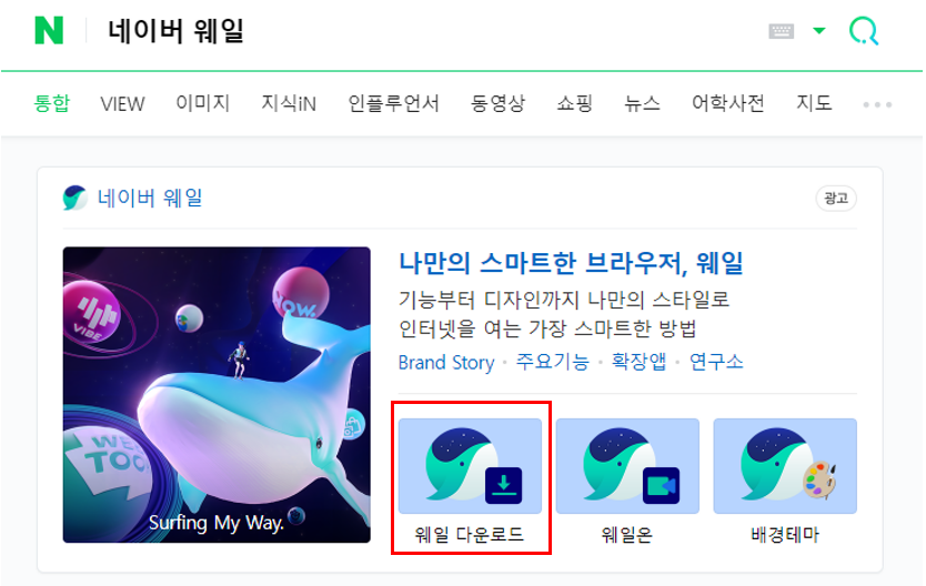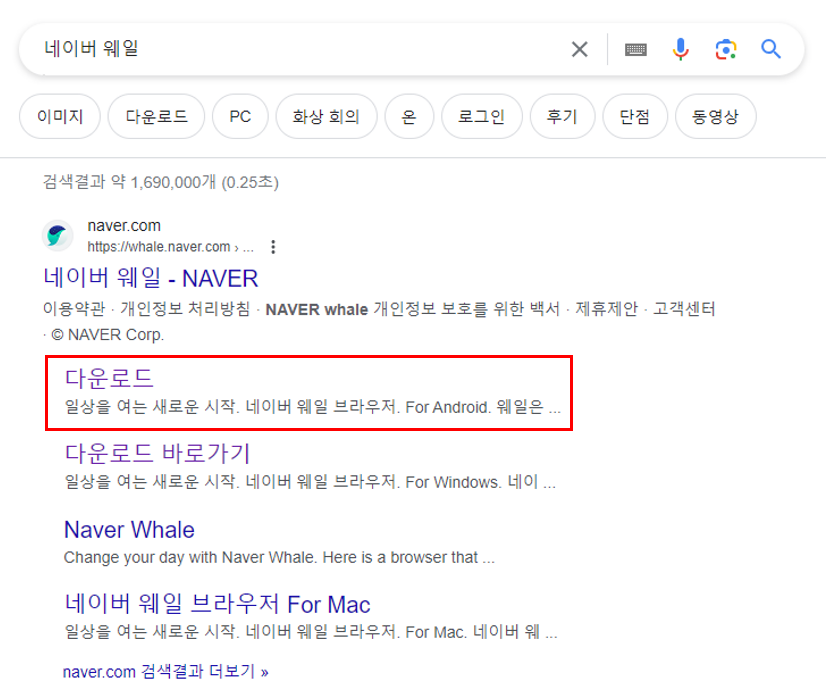 - 네이버 : 네이버에서 '네이버 웨일'을 검색한 후 하단에 웨일 다운로드를 클릭합니다.