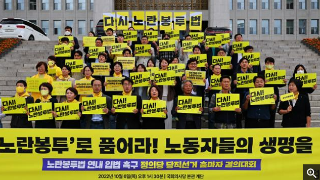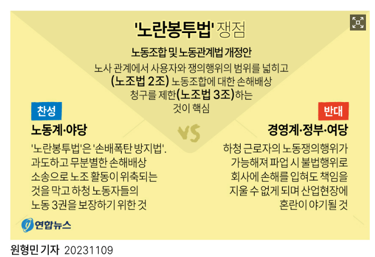보수 정당은 “노동계에 과도한 힘을 실어주는 법”이라며 반대하고 있고, 진보 정당과 노동계는 “노동자 생존권을 위한 최소한의 안전장치”라고 주장하고 있습니다.