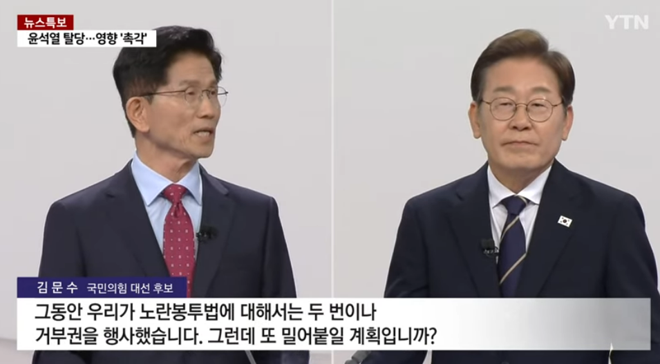 2025년 5월 18일에 열린 제21대 대통령 선거 첫 TV 토론회에서 주요 후보들은 노란봉투법에 대한 입장을 명확히 밝혔습니다.