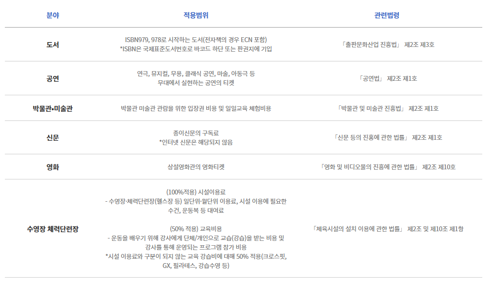즉, 공연·영화·도서 구입·박물관이나 미술관 입장 등 특정 문화활동에 지출한 비용을 연말정산 시 공제받을 수 있습니다.
