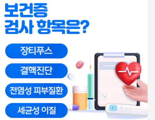 보건증 검사는 일반적으로 3가지 피부전염 질환 / 장티푸스 / 폐결핵 3가지 검사가 진행됩니다.