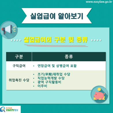 - 구직급여: 일반적인 실업급여로, 실직 후 재취업 활동을 하는 사람에게 지급됩니다.