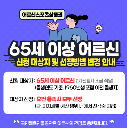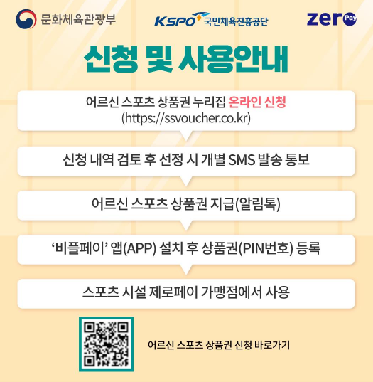 문화체육관광부는 고령화 사회 대응 및 어르신 건강 증진을 위해, 만 65세 이상 기초연금 수급자에게 스포츠 활동비 지원을 목적으로 하는 “어르신 스포츠 상품권” 사업을 운영 중입니다.