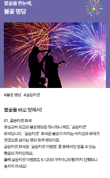 올해도 어김없이 여의도 세계불꽃축제가 예정되어 있습니다. 불꽃을 잘 볼 수 있는 자리를 확보하기란 '하늘의 별따기' 수준이죠? 그런데 서울시에서 올해는 명당인 노들섬 잔디마당에 '엄마아빠 행복존'을 만들어 가족 전용석을 운영하기로 했다고 합니다. 해당되시는 분들은 예약에 도전해보는게 어떨까요?