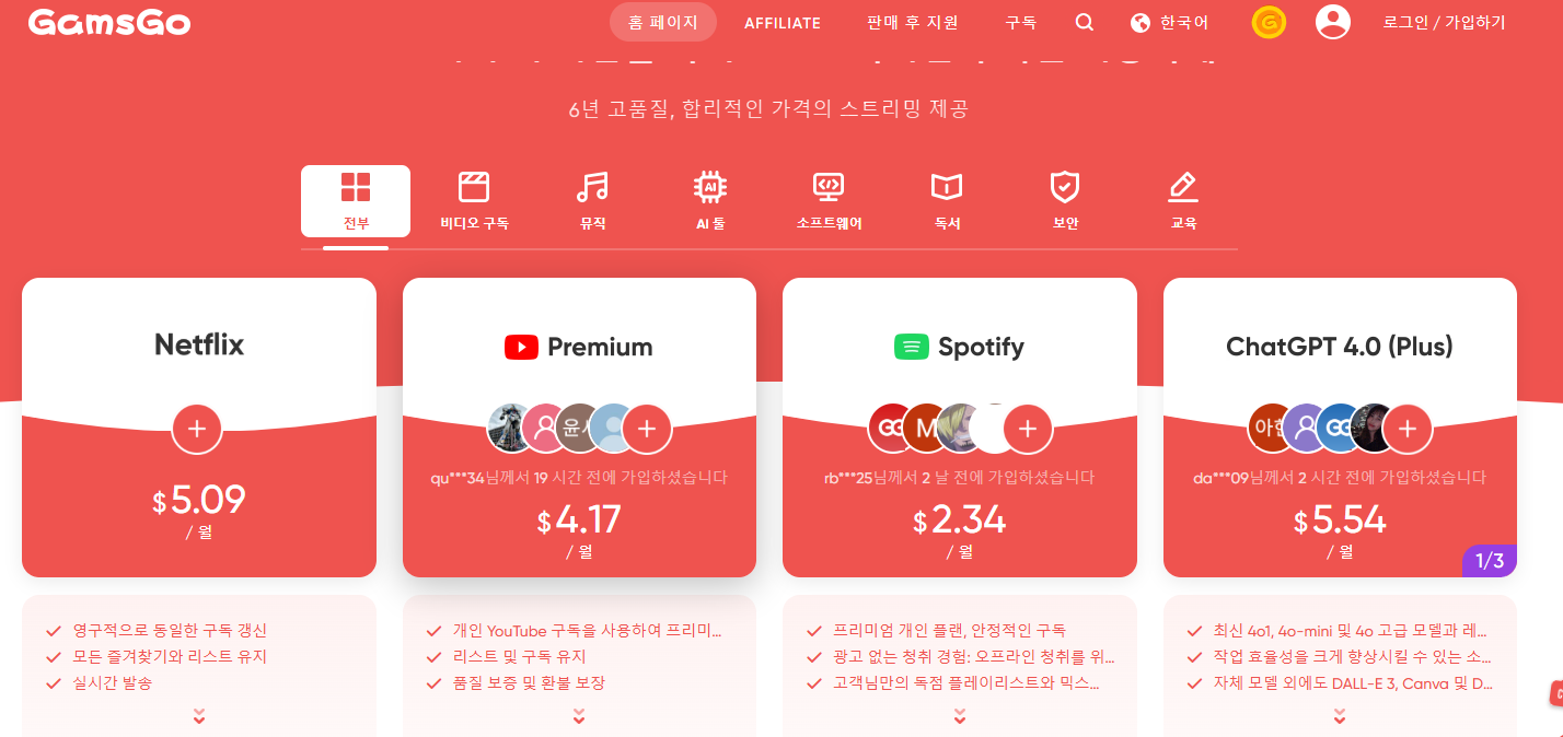 ✔ 겜스고 : 넷플릭스, 유튜브, 스포티파이, 챗지피티등 구독자 공유를 통해 보다 저렴한 가격으로 즐길 수 있습니다.