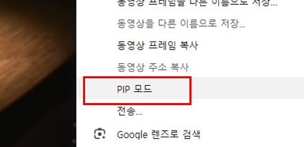 크럼 브라우저에서 유튜브 영상을 실행 >> 마우스 우클릭 후 PIP(Picture in Picjture) 모드 선택