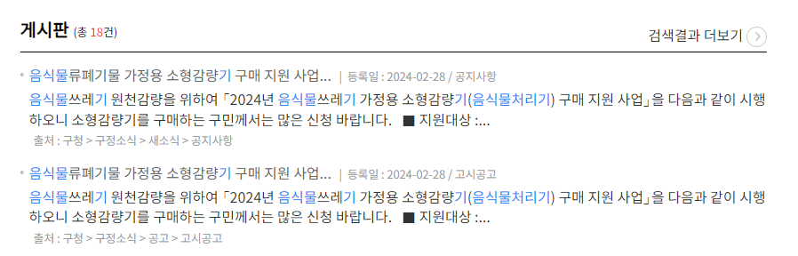 현 거주지가 어디인지 해당되는 시도구군별 홈페이지에 점속하여서 '음식물 처리기'라고 검색해보시면 관련 공고문을 검색할 수 있습니다.