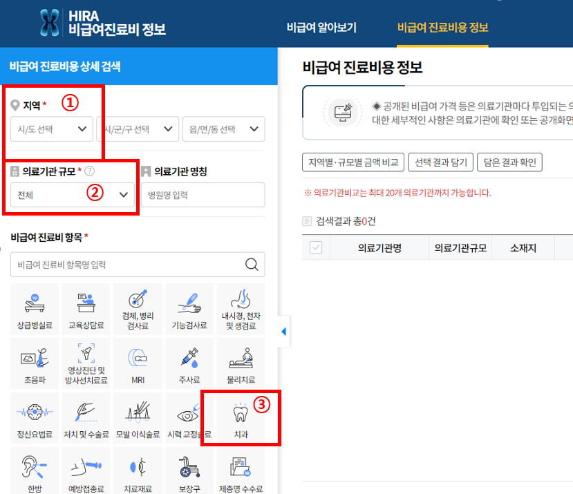 - 비급여진료비 정보 홈페이지 접속하여 1) 지역선택 - 2) 의료기관 규모 선택 - 3) 치과 선택합니다.