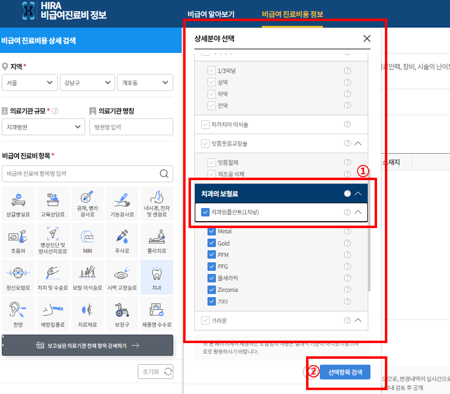 - 상세분야 선택에 1) 치과임플란트 - 2) 선택항목 검색을 클릭합니다.
