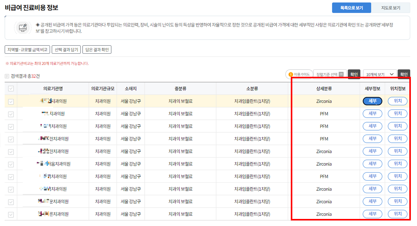 - 검색된 치과 세부 내역을 클릭해보면 비급여 세부정보로 위와 같이 임플란트 비용을 확인하시면 됩니다.
