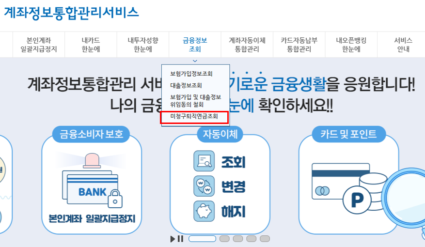 1) 어카운트 인포 접속 후 - 금융정보조회 - 미청구퇴직연금 조회 클릭
