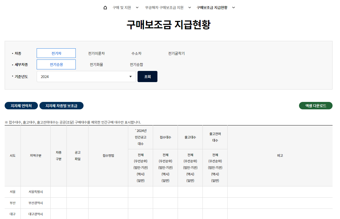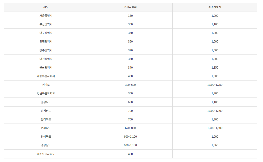지차제 보조금은 말그대로 지자체 예산으로 운영되기 때문에 지자체별로 지원금액이 다릅니다. 서울은 180만원, 대구 350만원, 경상남북도는 600~최대 1,150만원이 지급되네요. 아직 확정되지 않은 곳도 있기 떄문에 자세한 정보는 '무공해차 ㅗ통합누리집'을 통해 알아보시면 될 것 같습니다.