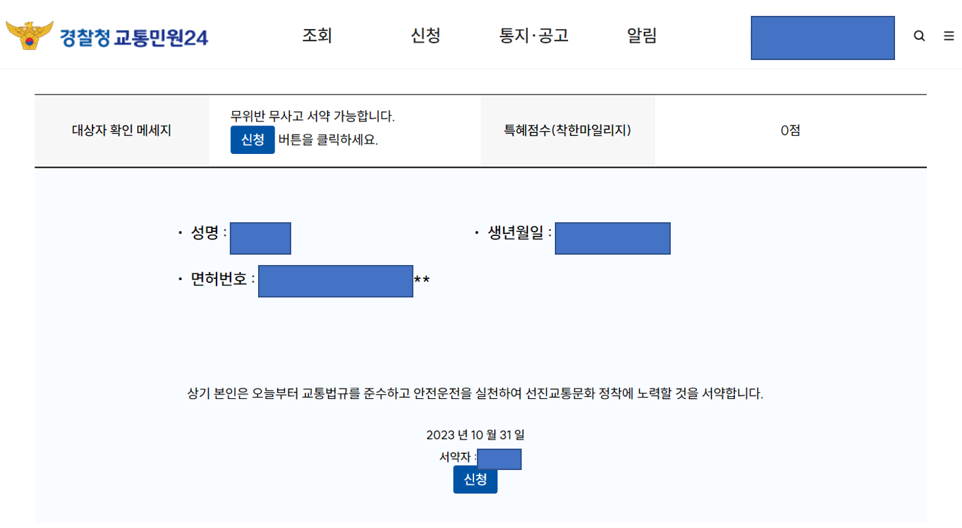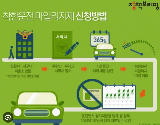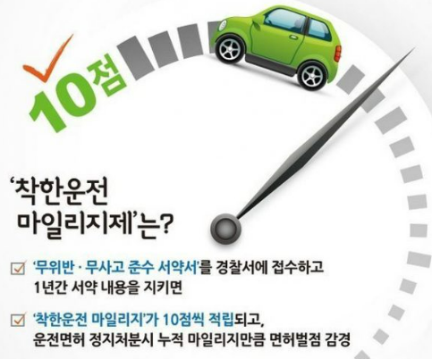 2013년 처음 시작된 사업으로 1년관 무위반 / 무사고 준수 서약 내용을 지킨다면 마일리지 10점씩을 부과하여 이후 누적된 점수만큼 벌점을 감경해주는 제도입니다.