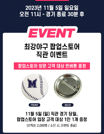 직관일에는 팝업스토어 방문 고객 대상으로 핀버튼을 증정한다고 합니다. 선착순이니 직관하러 가시는 분들은 조금 서두르셔서 굿즈 받으면 좋을 것 같습니다.