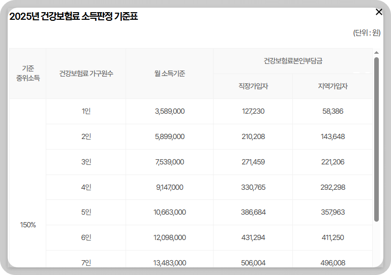 ✔ 가구당 기준 중위소득 150% 이하 (2025년 3월 고지금액으로 산정)
