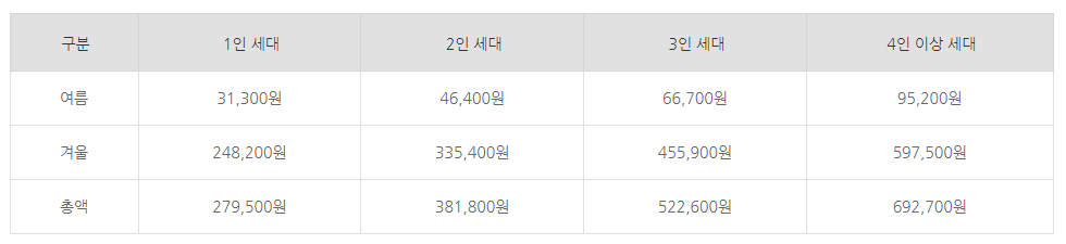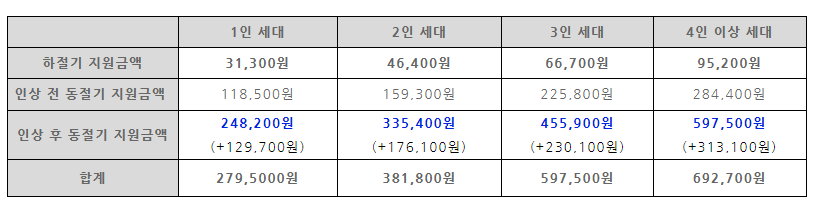 신청을 완료하면 신청 - 선정 - 지급 - 사용/정산 - 사후관리 단계가 진행됩니다. 전년도에 비해 지원금액이 높아졌으며 세대를 구성하는 가족수에 따라 다르게 지급됩니다. 해당되시는 분들은 꼭 신청하셔서 따뜻한 겨울 보내시길 바랄게요!