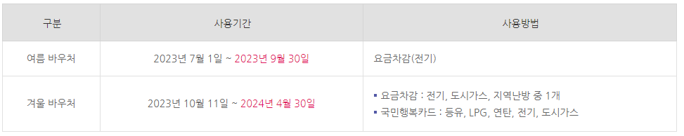 ** 요금차감은 2024년 4월 30일까지 에너지 공급사에서 차감 신청 및 요금 고지서가 청구된 경우에 한해 지원가능합니다. 국민행복카드는 사용기간에 카드 결제가 완료되어야 합니다.