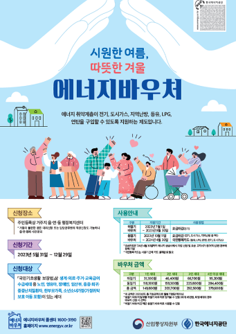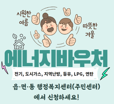 에너지 취약계층을 위해 에너지 바우처를 지급하여 전기 / 도시가스 / 지역난방 / 등유 / LPG / 연탄을 구입할 수 있도록 지원하는 제도입니다.