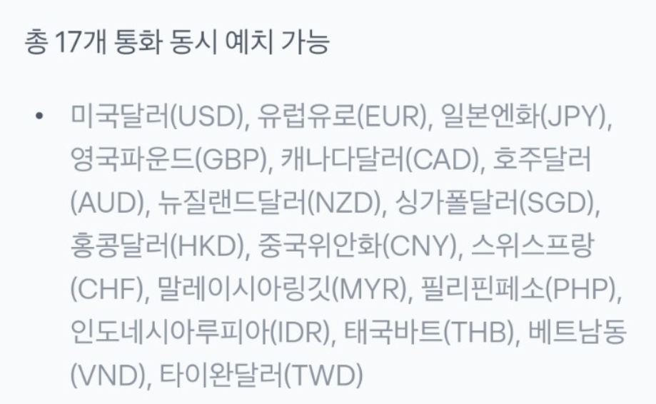 대표적인 외화인 달러, 유로, 엔화를 비롯한 17개국의 통화를 동시에 예치 가능합니다.
