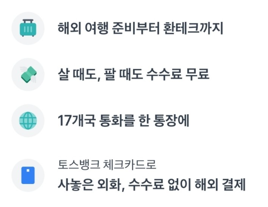환율의 등락에 따른 환테크뿐만 아니라 사 놓은 외화를 토스 뱅크 체크카드를 통해 해외 결제도 가능한 점이 가능 큰 매리트 같습니다.