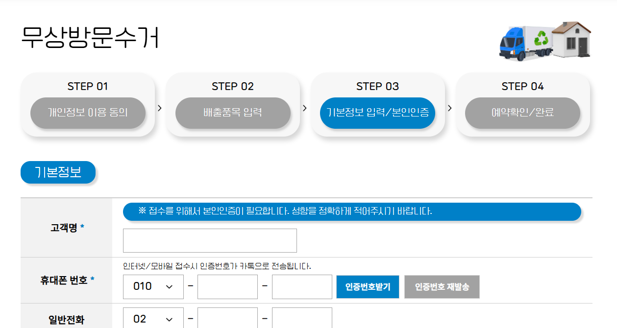 개인정보 및 수거정보를 입력해야합니다.
