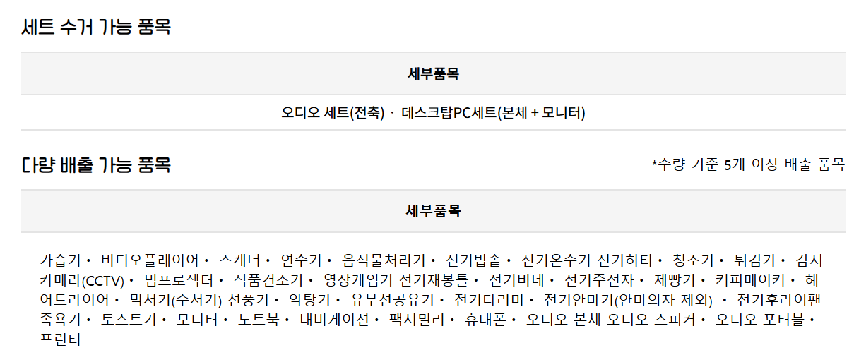 무료수거가 가능한 품목은 다음과 같습니다: