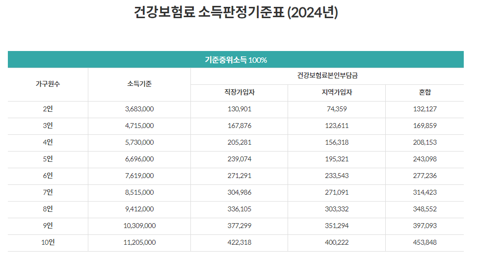 이후 자신의 건강보험료와 2024 건강보험료 소득판정 기준표와 비교하시면 우리 가구의 중위소득을 예측할 수 있습니다.