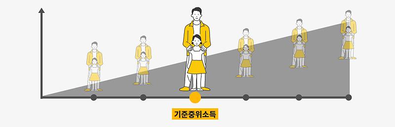 중위소득 100%는 우리나라 국민을 100가구라 정하고, 소득이 적은 가구부터 많은 가구까지 순서대로 나열했을 때 50번째에 오는 가구의 소득수준을 의미합니다. 따라서 중위소득 75%는 가구 소득 중간값보다 25% 적은 소득을 나타내는 것 입니다. 이렇게 기준 중위소득을 알게되면 특정 가구의 소득이 비교적 고소득인지, 저소득인지 상대적인 분포를 파악하는데 용이합니다.