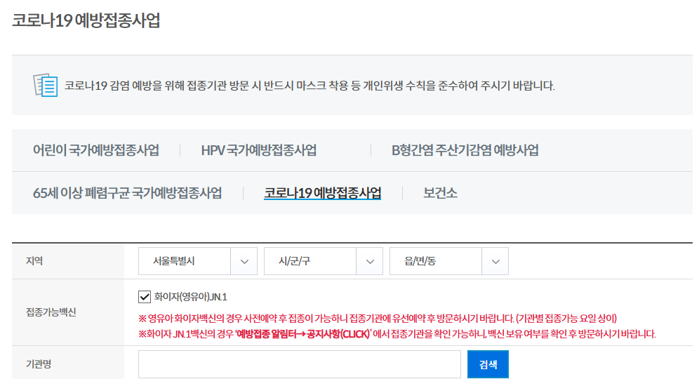- 재고량과 접종 가능 요일이 기관별로 다르므로, 방문 전 전화로 확인 예약 후 방문하는 것이 좋습니다