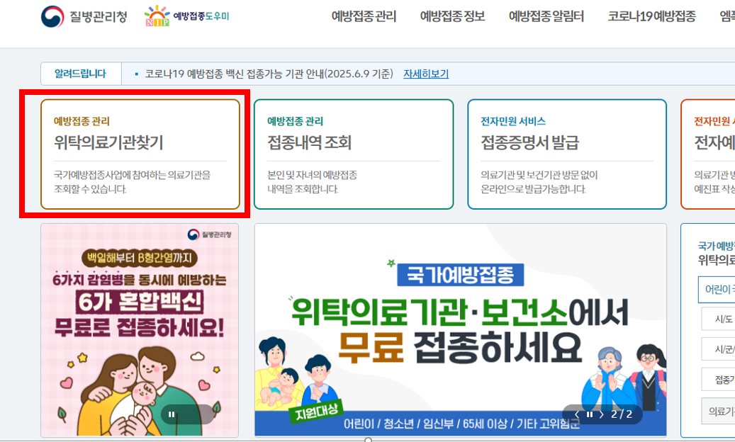 - 예방접종도우미 누리집(https://nip.kdca.go.kr/)의 예방접종 관리 → 위탁의료기관 찾기 메뉴 활용