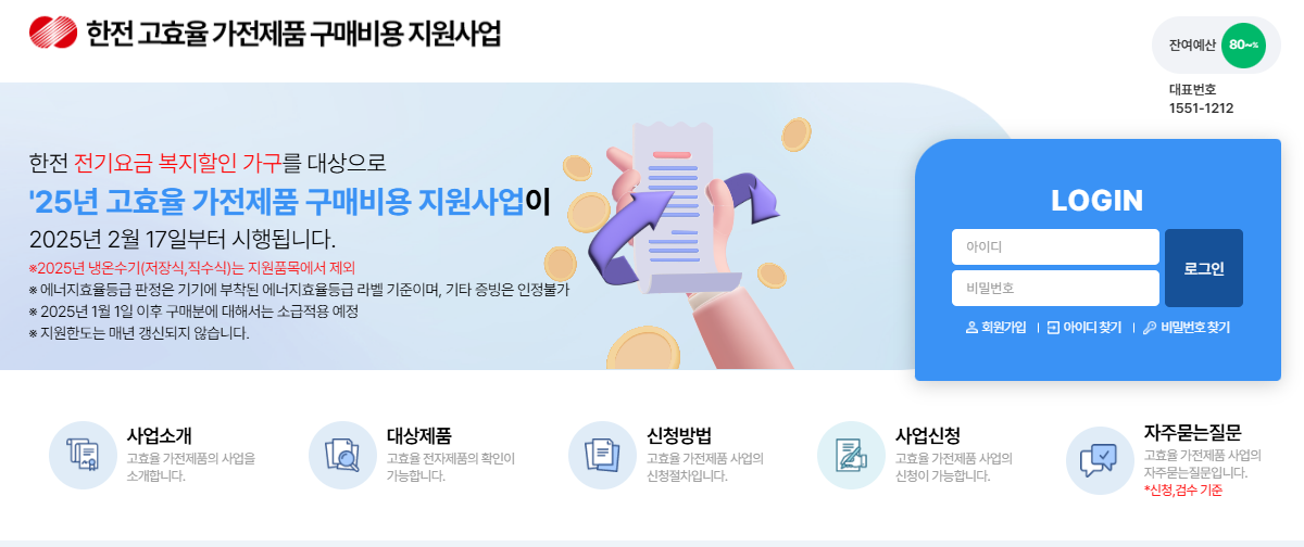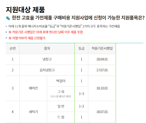 - 지원 사업 신청은 한전 고효율 가전 구매비용 지원사업 메뉴에서 가능.
