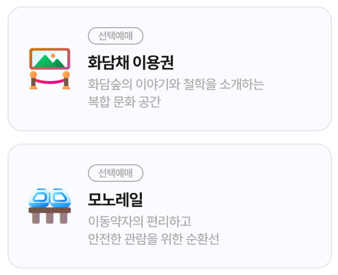화담채 및 모노레일을 구매하기 위해선 화담숲 입장권을 먼저 선택해야 합니다.