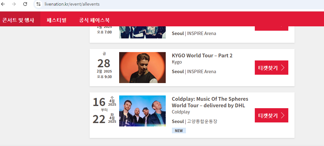 3) 라이브네이션 코리아 홈페이지 > 콘서트 및 행사 > 선예매를 원하는 공연 클릭!