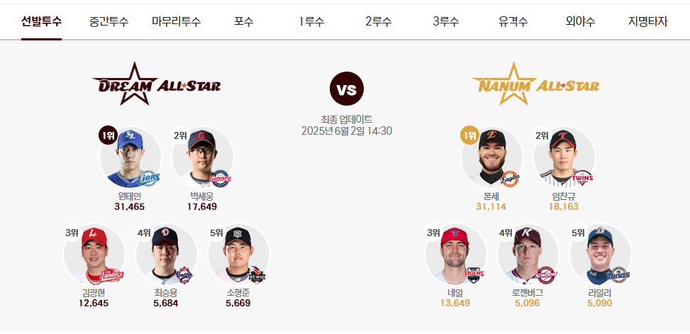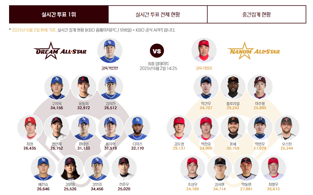 4. 2025년 KBO 야구 올스타 실시간 투표 현황