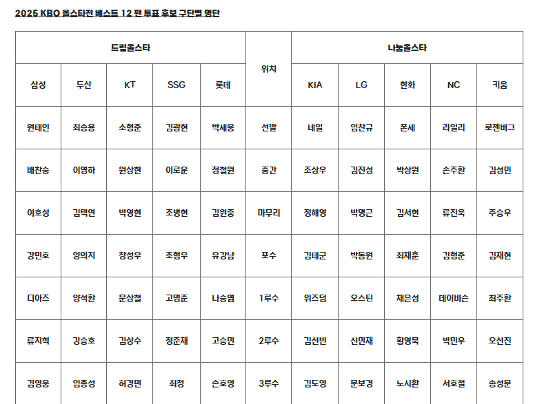3. 2025년 KBO 올스타 베스트 12 구단별 명단