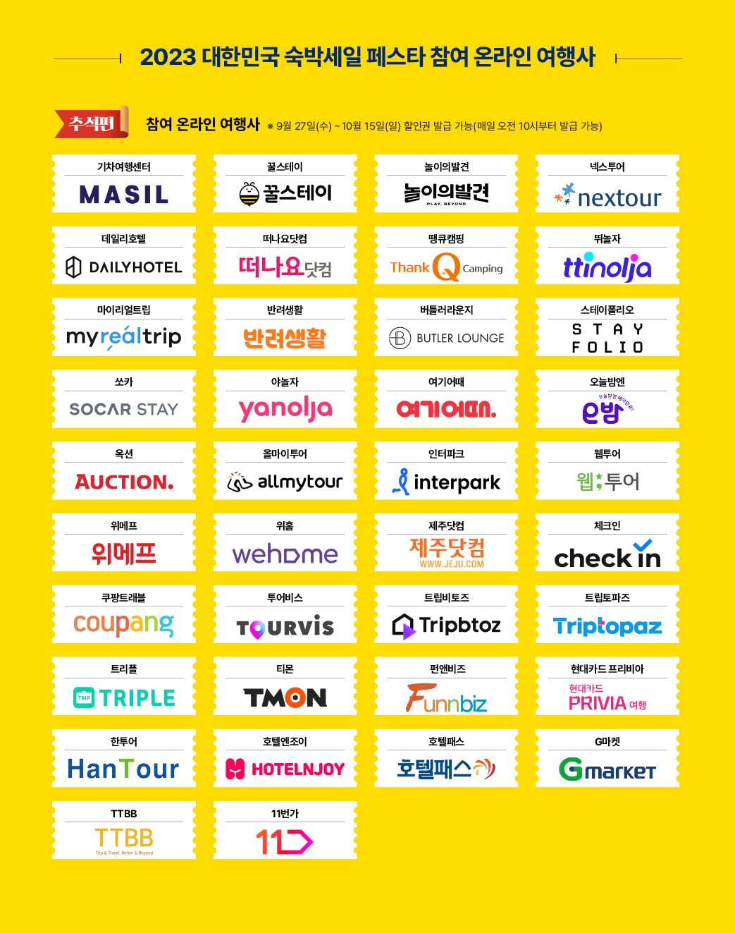 9월 27일부터 10월 15일까지 44개의 온라인 여행사와 호텔, 콘도, 모텔, 농어촌민박 등 3만여개의 숙박시설에 대한 이용요금 할인을 받을 수 있다고 합니다. 쿠폰은 매일 10시 온라인 여행사 채널에서 발급된다고 하니 꼭 체크하셔서 황금연휴 즐기시길 바랄게요.