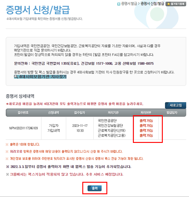 6) 새로고침 버튼을 눌러서 4대기관이 모두 출력가능으로 바뀌면 증명서 출력 버튼이 활성화 됩니다.