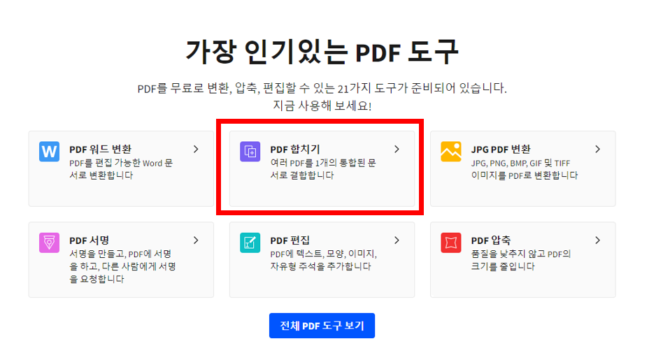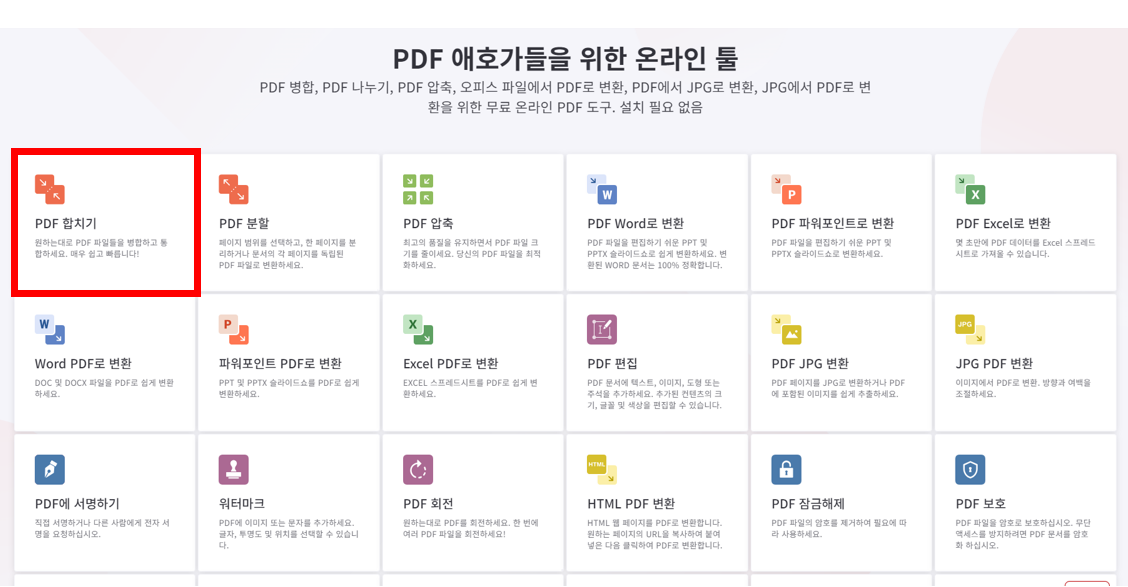 PDF 합치기, 분할, 압축 뿐만 아니라 포맷 변환등 다양한 기능을 제공합니다.